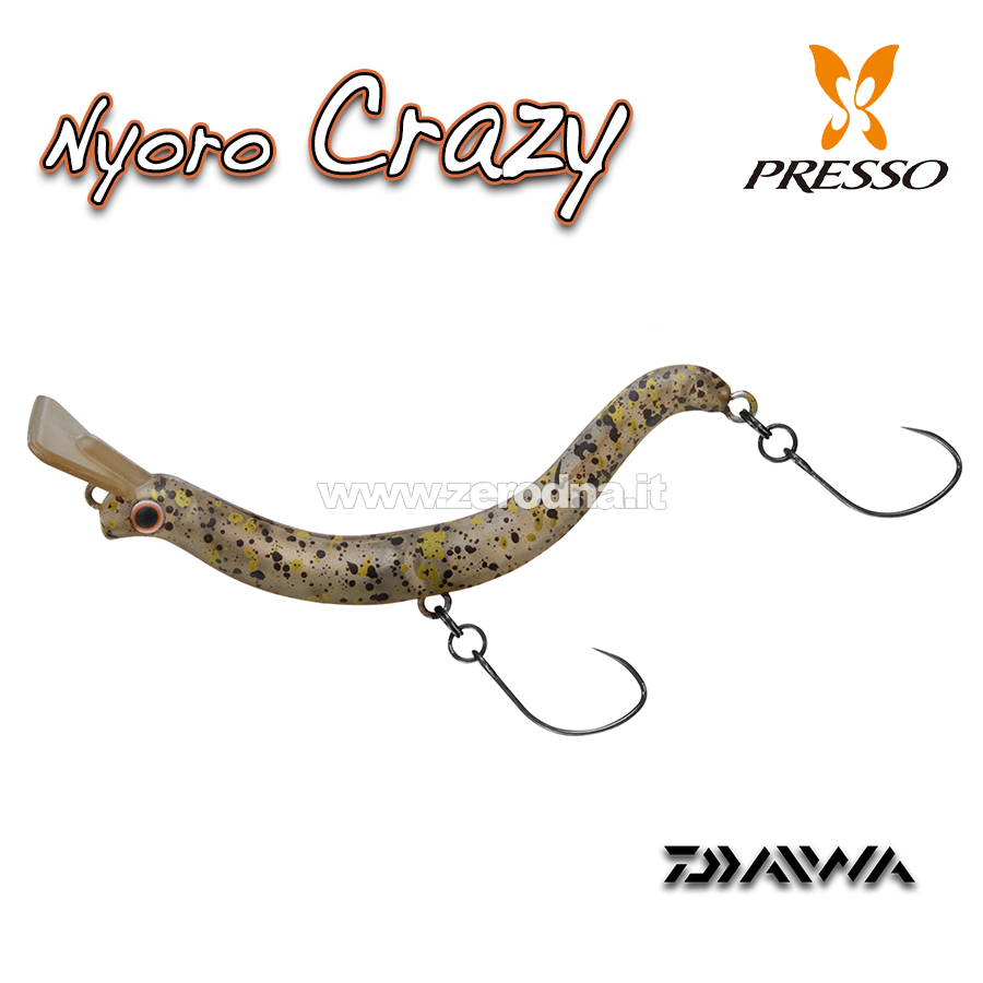 Il Nyoro Crazy è un’esca che riprende le caratteristiche di una vecchia esca Daiwa del 2010 , il Nyoro 45ss. Cambiano le dimensioni e il peso, infatti è un 5.7 cm per 3.5 gr. Esca che si lancia molto bene e che in acqua ha un movimento molto particolare, sembra quasi uno snodato con l’oscillazione di uno spoon. Non ha bisogno di recuperi veloci, il movimento è garantito anche a basse velocità e basta alzare o abbassare la canna per mantenere lo strato d’acqua desiderato.